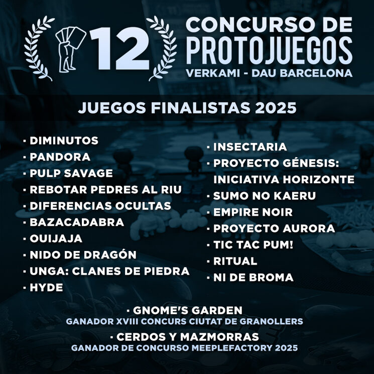 Y como ya es tradición, mantenemos la colaboración con los concursos de prototipos del Festival de Juegos de Mesa y Rol de Granada MeepleFactory y la Fira JugarxJugar de Granollers, de manera que sus 2 ganadores: Cerdos y Mazmorras y Gnome’s Garden pasan como finalistas automáticos a la fase final de nuestro Concurso Verkami DAU Barcelona.